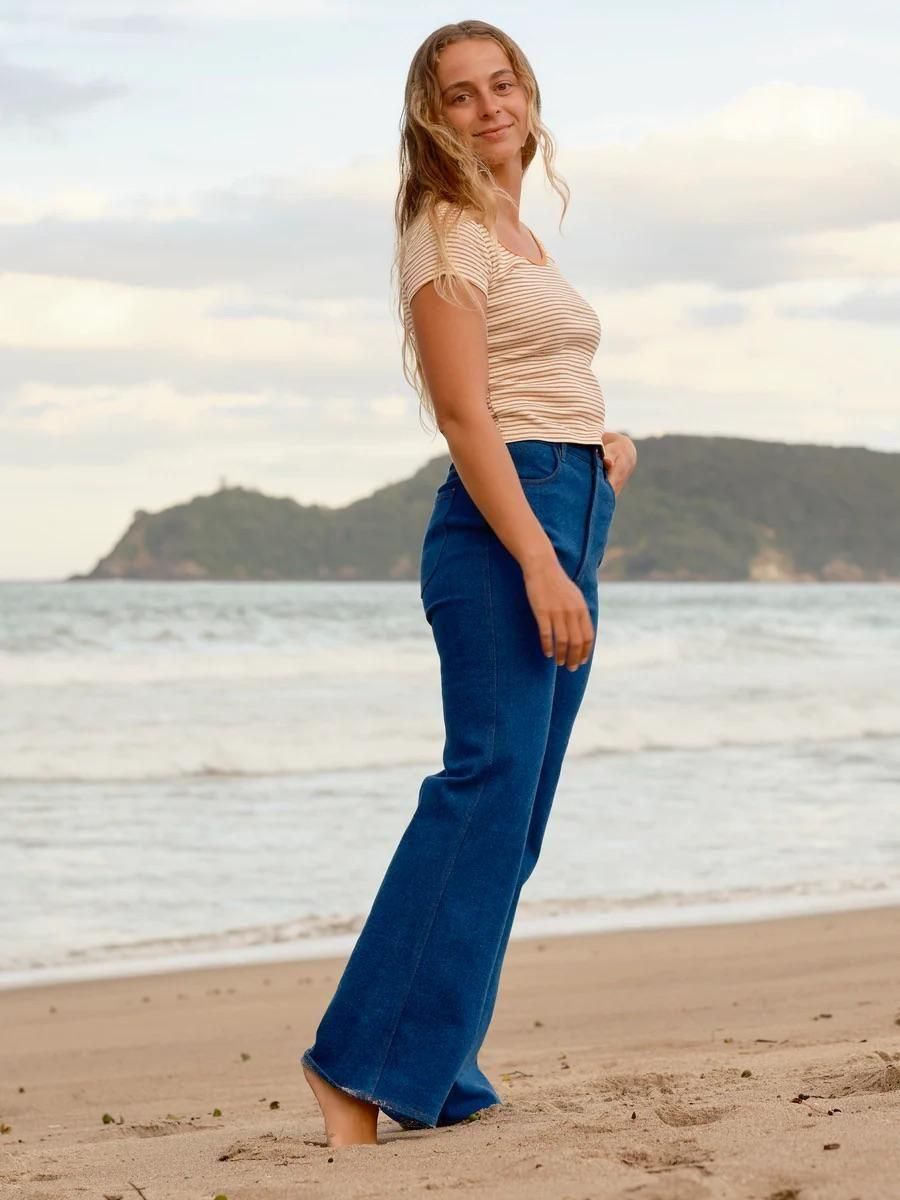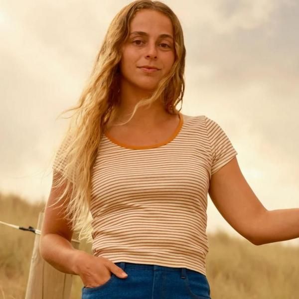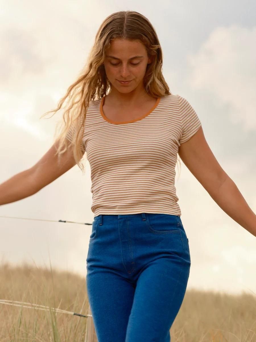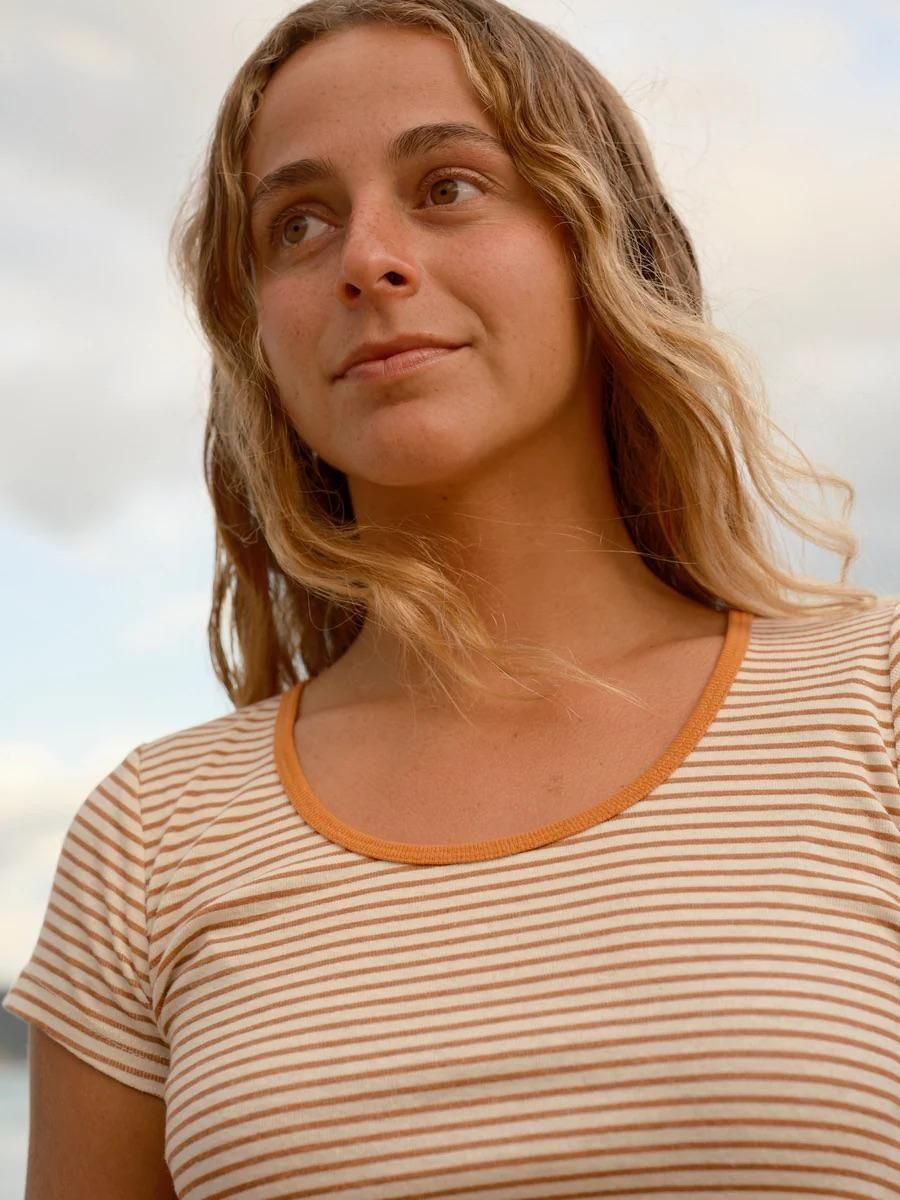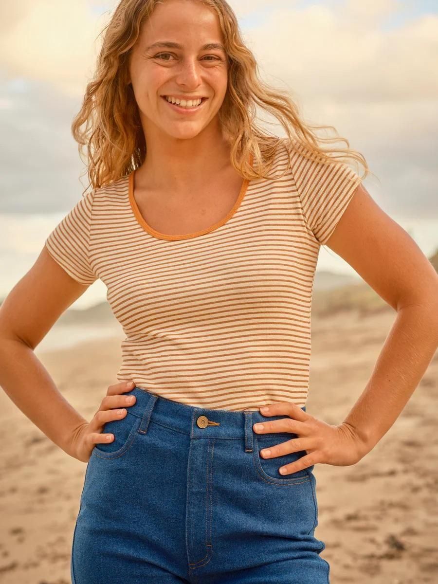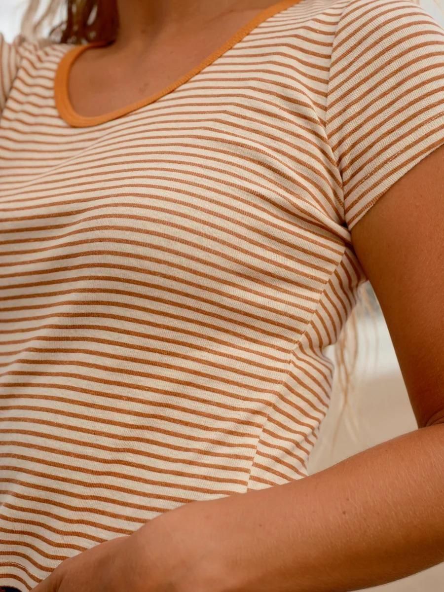 A scoop neck baby tee in hemp rib stripes with contrast binding.