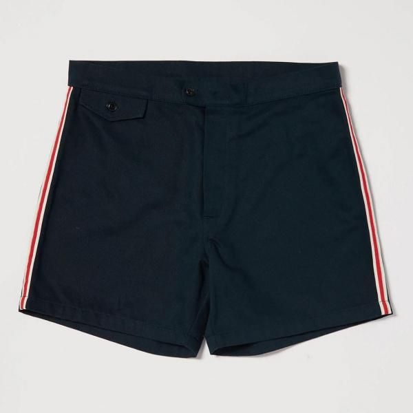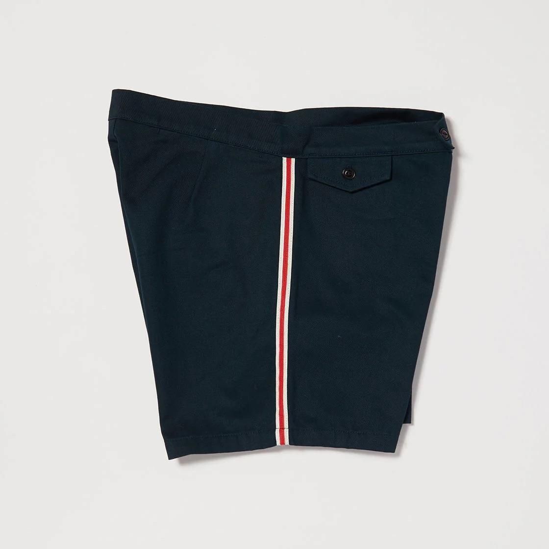 These trunks are representative of the 50s with a simple design featuring a button fly, change pocket, and trimming tape on both sides. If you look at photos and videos from that time, you'll see that everyone was wearing the navy blue with red and white stripes. The people wearing them were Joe Quigg, Buzzy Trent, Peter Cole, Rick Gregg, George Downing, and Bud Browne. I don't think I need to explain, but they were all the greatest!